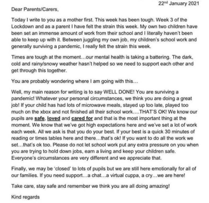 „Драги родители/негуватели, денес првенствено ви пишувам како мајка. Оваа недела беше напорна. Трета недела како е карантин и како родител чувствувам товар и напор. И моите две деца имаа многу задачи од училиштето и јас буквално не можев да држам чекор со сето тоа. Помеѓу жонглирањето на мојата работа и училишните задачи на децата и преживување на пандемијата генерално, навистина го чувствувам притисокот оваа недела. Времињата се тешки во моментов… нашето ментално здравје е навистина кревко. Темното, студено и врнежливо време не ни помага баш, па потребна ни е меѓусебна поддршка за да го поминеме ова заедно.